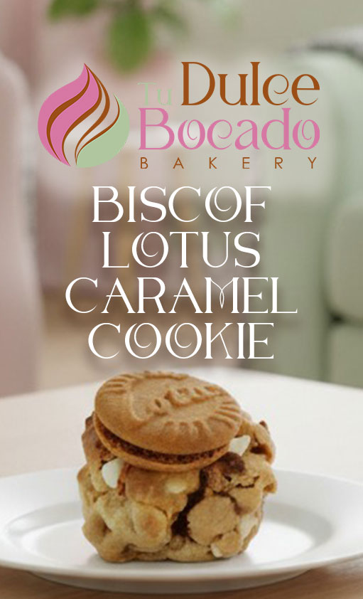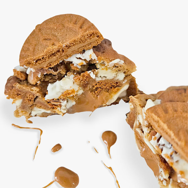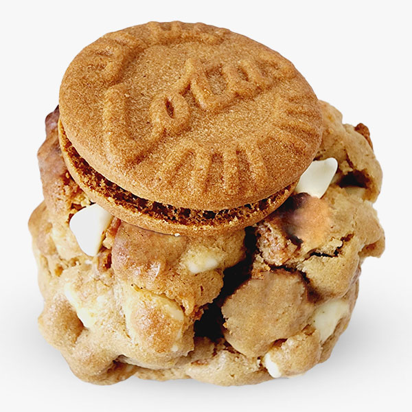 Made with pieces of Lotus cookies and cookie cream, white chocolate chips. Fill with cookie cream and caramel.